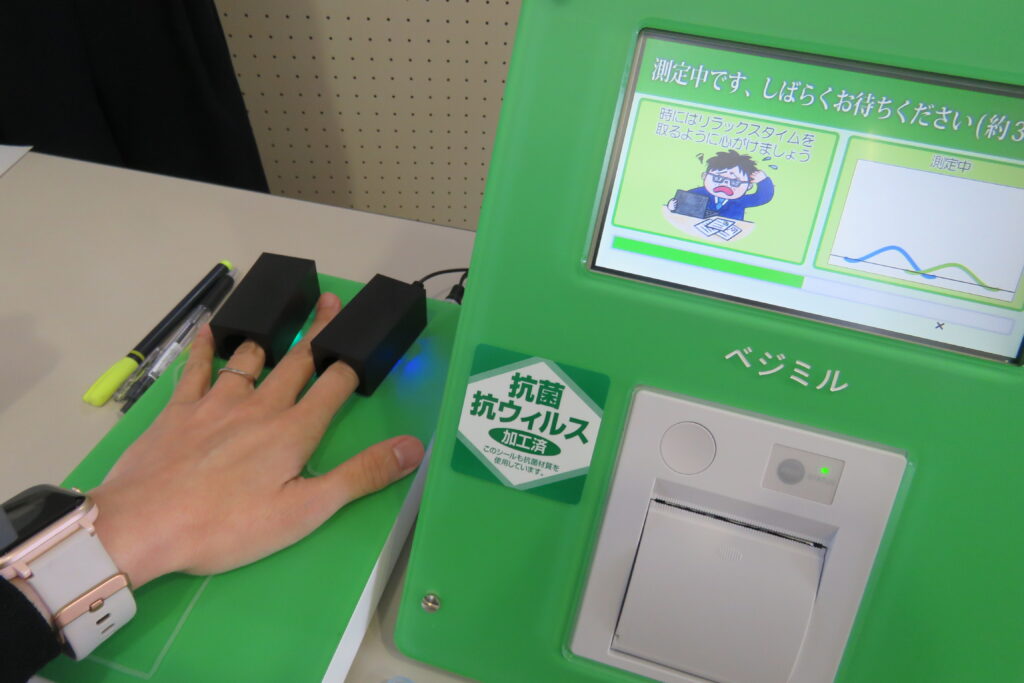 専用の測定器に指をいれるだけで日頃の野菜の摂取量を確認し,体験者は食生活を見直すきっかけにされました。