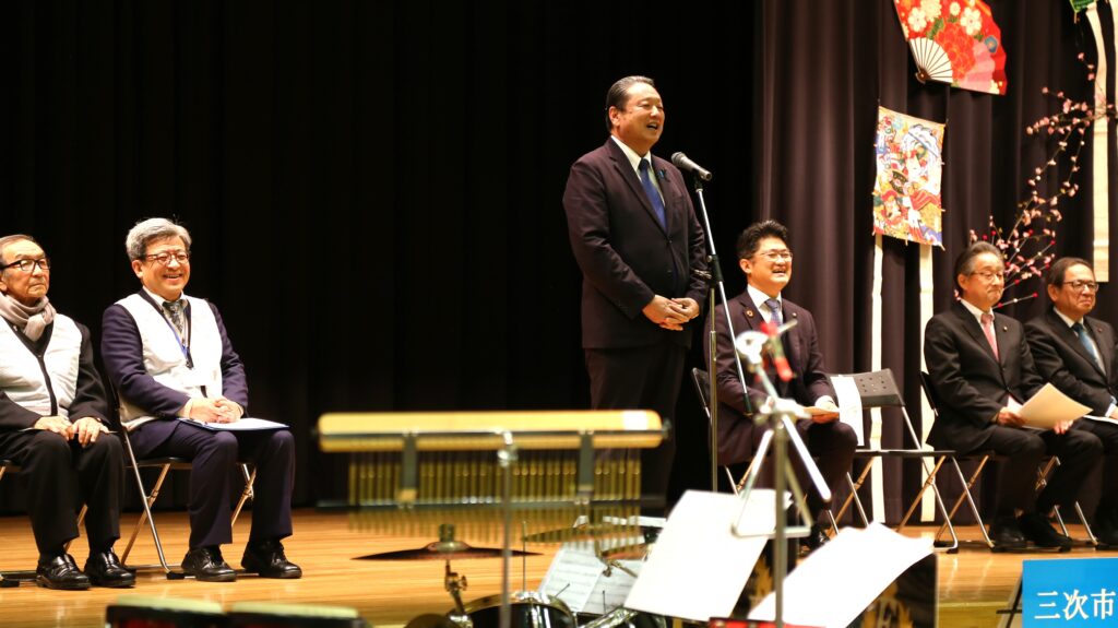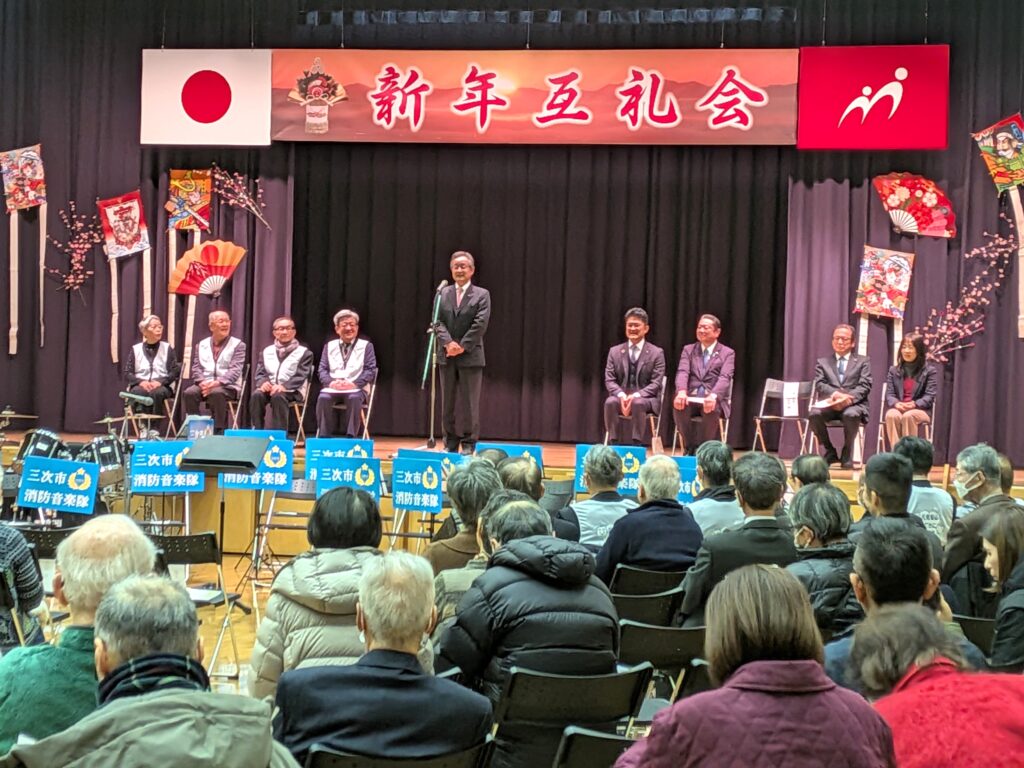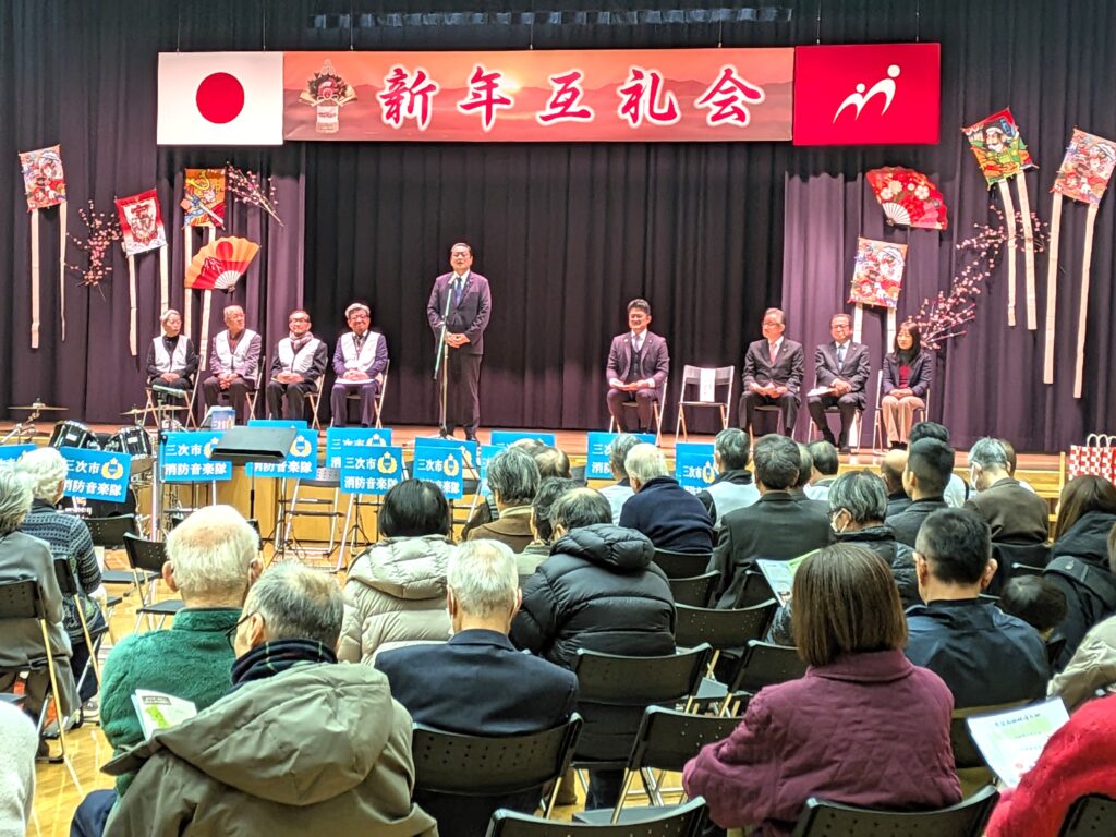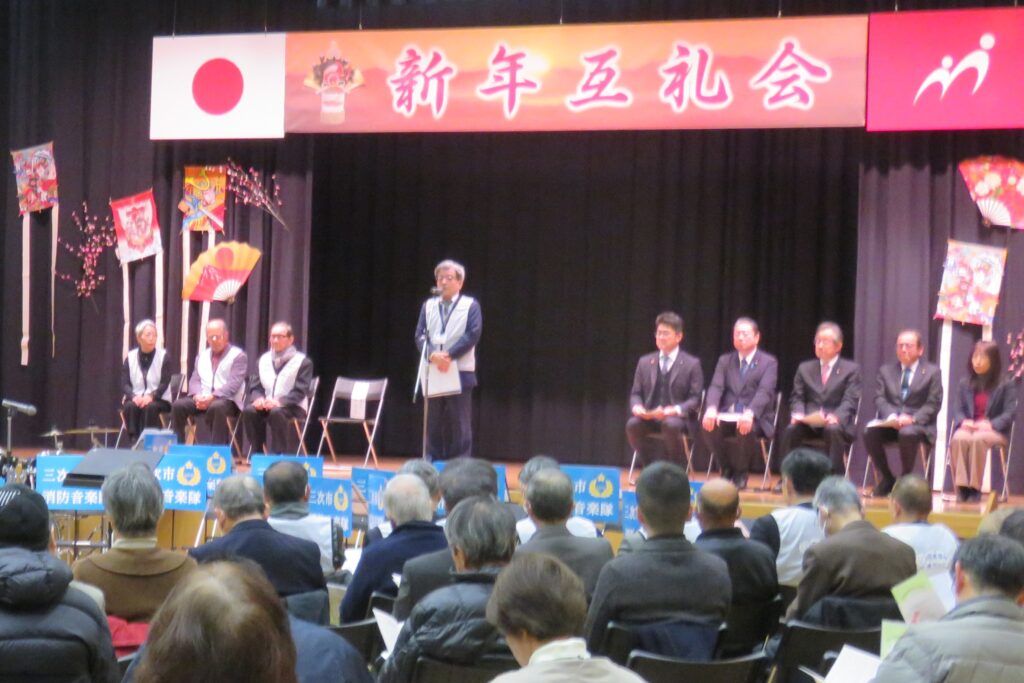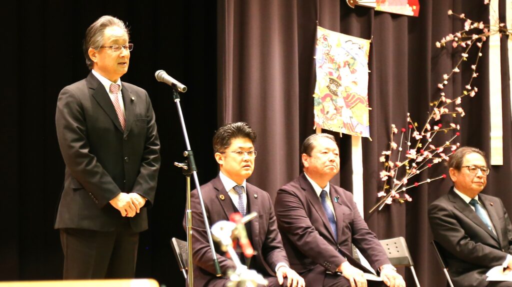 その後,開会式では,第一部として,道原会長の年頭挨拶に続き,福岡三次市長,下森県議会議員,小田市議会議員よりご祝辞をいただきました。