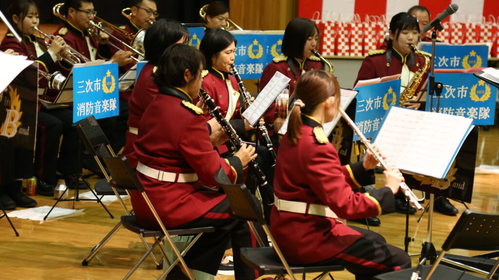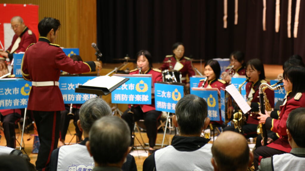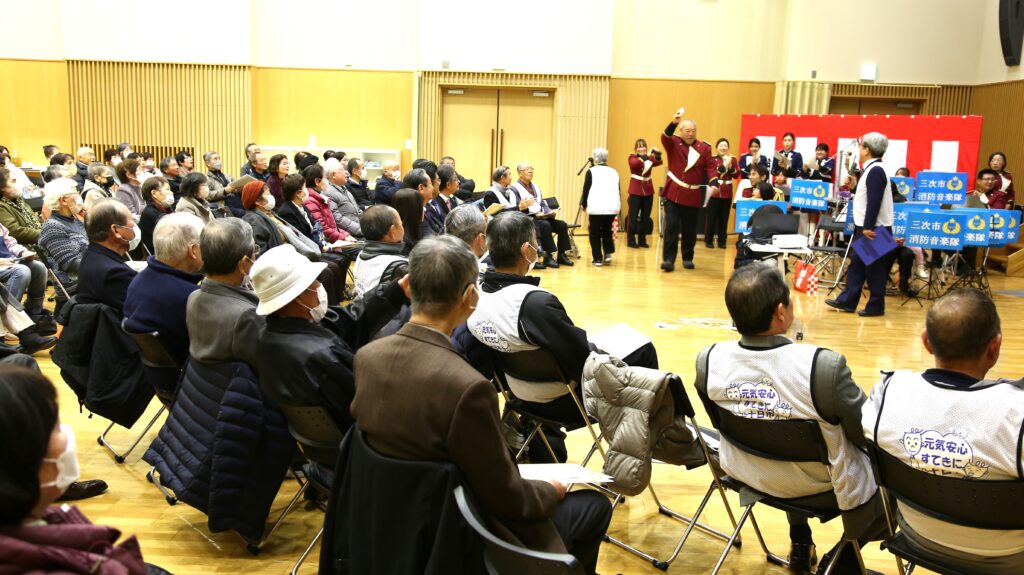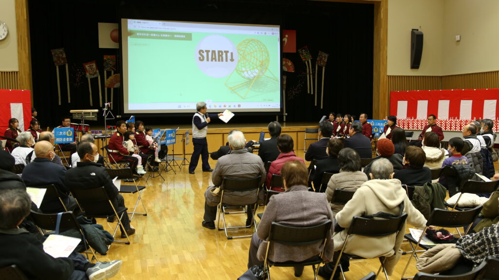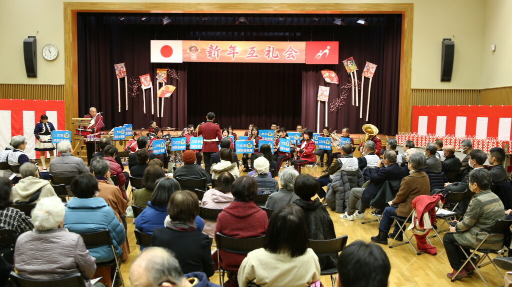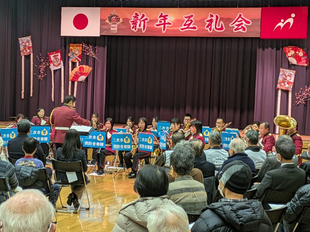 第二部のアトラクションでは,三次市消防音楽隊をお迎えし,「新春演奏会」と題して吹奏楽の演奏とカラーガードの演技を披露いただきました。